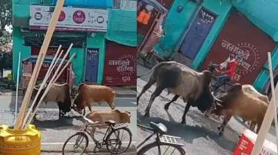 बेकाबू सांड़ों की कुश्ती से मचा हड़कंप, घर का गेट तोड़ा, महिलाएं आईं चपेट में