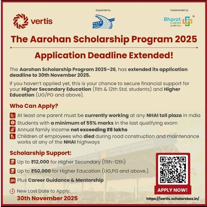 नई दिल्ली। देश के विभिन्न राज्यों के सड़क मार्ग पर तैनात टोल प्लाजा सभी कर्मचारियों , सुपरवाइजर , गार्ड, के लिए यह अच्छी खबर है। इन कर्मचारियों के बच्चों को पढ़ाई के लिए विशेष आर्थिक सहायता मिलेगी। यह आर्थिक सहायता ” आरोहण स्कालरशिप प्रोग्राम 2025 ” के अन्तर्गत दी जाएगी। इसके लिए में निर्धारित फार्म भरना होगा।आरोहण स्कालरशिप प्रोग्राम 2025 पूरे भारत के किसी भी टोल प्लाज़ा पर कार्यरत कर्मचारियों के आश्रित बच्चों के लिए है। इस योजना के अंतर्गत 11वीं–12वीं एवं उच्च शिक्षा (UG/PG) के विद्यार्थियों को ₹12,000 से ₹50,000 तक की छात्रवृत्ति प्रदान की जाएगी। साथ ही छात्रों को कैरियर मार्गदर्शन और मेंटरशिप सहायता भी दी जाएगी। इस स्कॉलरशिप प्रोग्राम में TC, सुपरवाइज़र या अन्य कोई भी कर्मचारी जो टोल प्लाज़ा पर कार्यरत हैं, वे आवेदन कर सकते हैं। आवेदन करने वाले विद्यार्थियों के माता/पिता/पोषक में से किसी एक का टोल प्लाज़ा पर कार्यरत होना आवश्यक है, तथा परिवार की वार्षिक आय ₹8 लाख से अधिक नहीं होनी चाहिए। आरोहण स्कालरशिप प्रोग्राम में आवेदन की अंतिम तिथि 30 नवम्बर 2025 है।