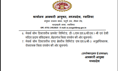 ग्वालियर। नकली शराब परिवहन परमिट और अवैध शराब की आपूर्ति से जुड़े गंभीर आपराधिक मामले में आबकारी आयुक्त, मध्यप्रदेश ने बड़ा प्रशासनिक कदम उठाया है। अपर सत्र न्यायाधीश देपालपुर द्वारा दोष सिद्ध होने के बाद सोम डिस्टलरीज प्रायवेट लिमिटेड, सेहतगंज (रायसेन) एवं सोम डिस्टलरीज एंड ब्रेवरीज लिमिटेड, रोजराचक (रायसेन) के सभी प्रमुख आबकारी लाइसेंस तत्काल प्रभाव से निलंबित कर दिए गए हैं।