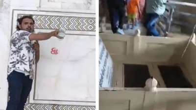 आगरा । आगरा के ताजमहल में घुसकर दो युवकों ने मुख्य मकबरे पर ऊपर से जल चढ़ा कर दीवार पर ओम का स्टीकर चिपका दिया। युवकों ने दावा किया कि...